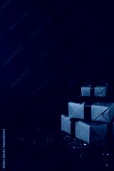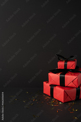 Side vertical view of elegantly wrapped red gifts with black ribbons, scattered confetti around