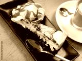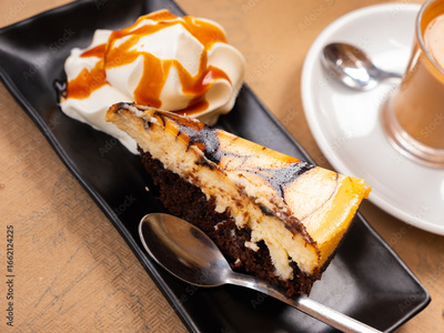 Closeup brownie cheese cake on black plate. Favorite dessert for chocolate lover