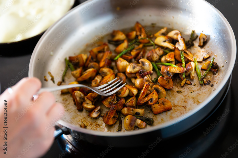 Finely chopped champignons and young asparagus shoots are fried in frying pan. Cooking process, household routine kitchen chores. Unknown hand is stirring contents of pan with fork