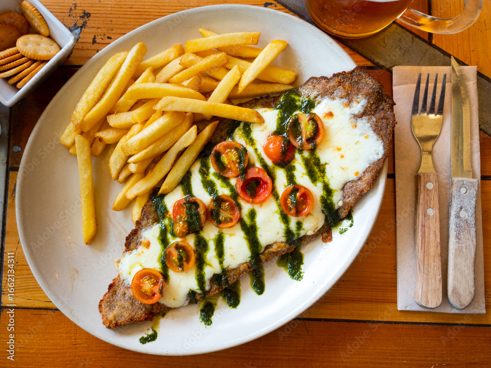 Appetizing Milanesa caprese, fried veal steak topped with cream cheese and ripe cherry tomatoes dressed with aromatic basil pesto sauce, served with french fries