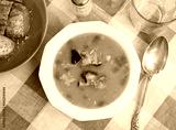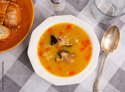 Fragrant pea soup with smoked meats and vegetables in bowl