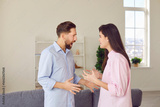 Young couple man and woman standing at home and arguing shouting in quarrel. Angry unhappy husband and wife quarreling in the living room. Marriage problems, relationship and divorce concept.