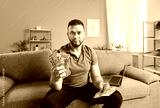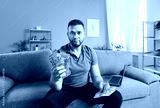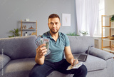 Rich happy blogger man with money cash, holding banknotes, showing impressive achievements, lottery winner, successful deal, bid game win, freelancer excited to achieve finance goal working online