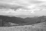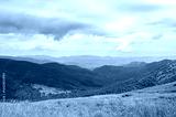 View of a mountain valley under a dramatic, cloudy sky. The foreground is a grassy meadow, while the distant mountains are layered in shades of blue and green. Carpathians, Ukraine
