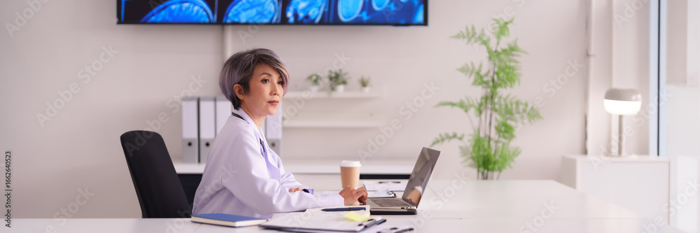 Asian adult female doctor medical professional works office hospital healthcare technology research
