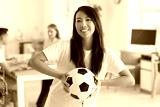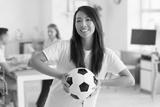 Female Asian PE teacher with soccer ball in school office