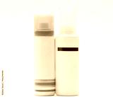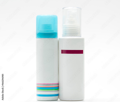 Spray bottle with blue cap and pump bottle of skincare on white background, blank label