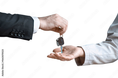 Hand of man in a formal suit handing over car keys to a woman's hand on isolated background. Concept of selling or renting a car