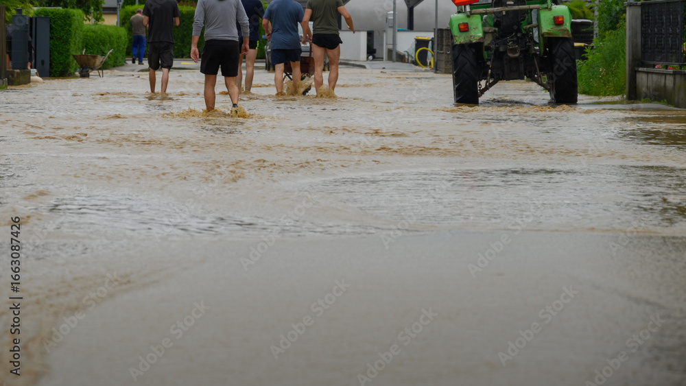 Floodwaters cover streets as residents navigate through knee-deep water, while a tractor assists in cleanup efforts during the flood.