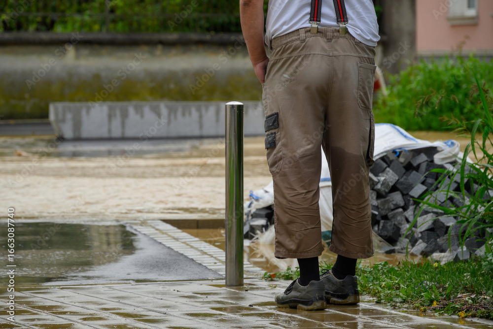 A man observes waterlogged ground next to construction materials after severe rainfall in a residential area, showcasing flood impact.