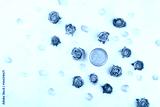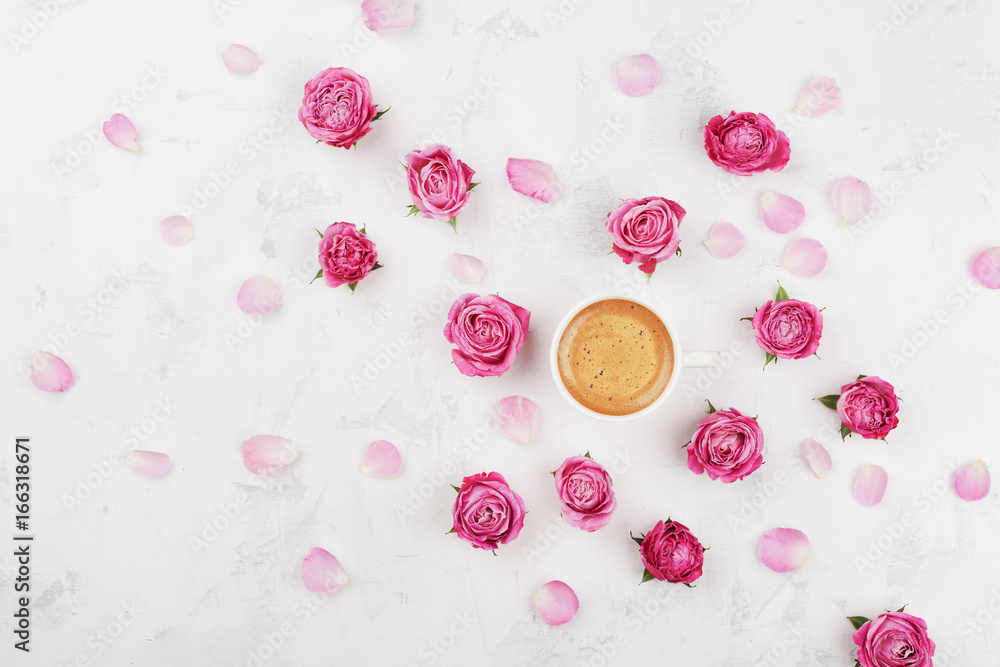 Morning coffee cup, petals and beautiful pink rose flowers on white stone table top view in flat lay style. Cozy breakfast on Mother or Woman day.