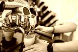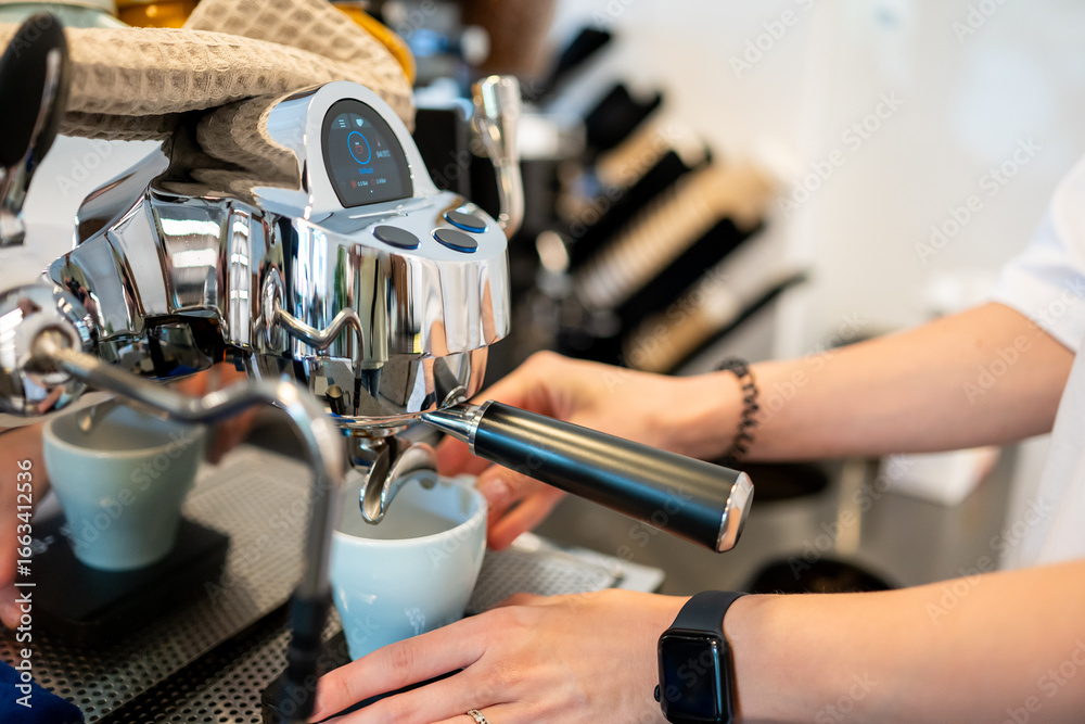 Barista preparing espresso with a portafilter in a modern coffee machine. White cup on drip tray, smartwatch and bracelet visible, coffee shop background blurred