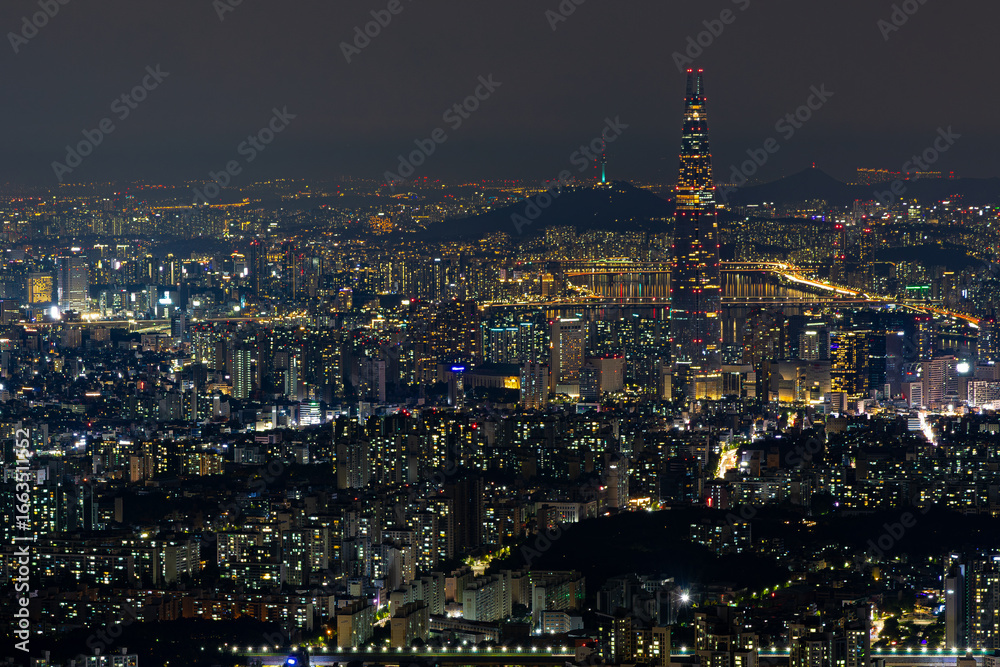 Panoramic Night View of Seoul City Skyline with Illuminated Skyscraper