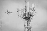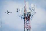 Drone UAV flying on the sky against communication tower for use cell site network to control operate
