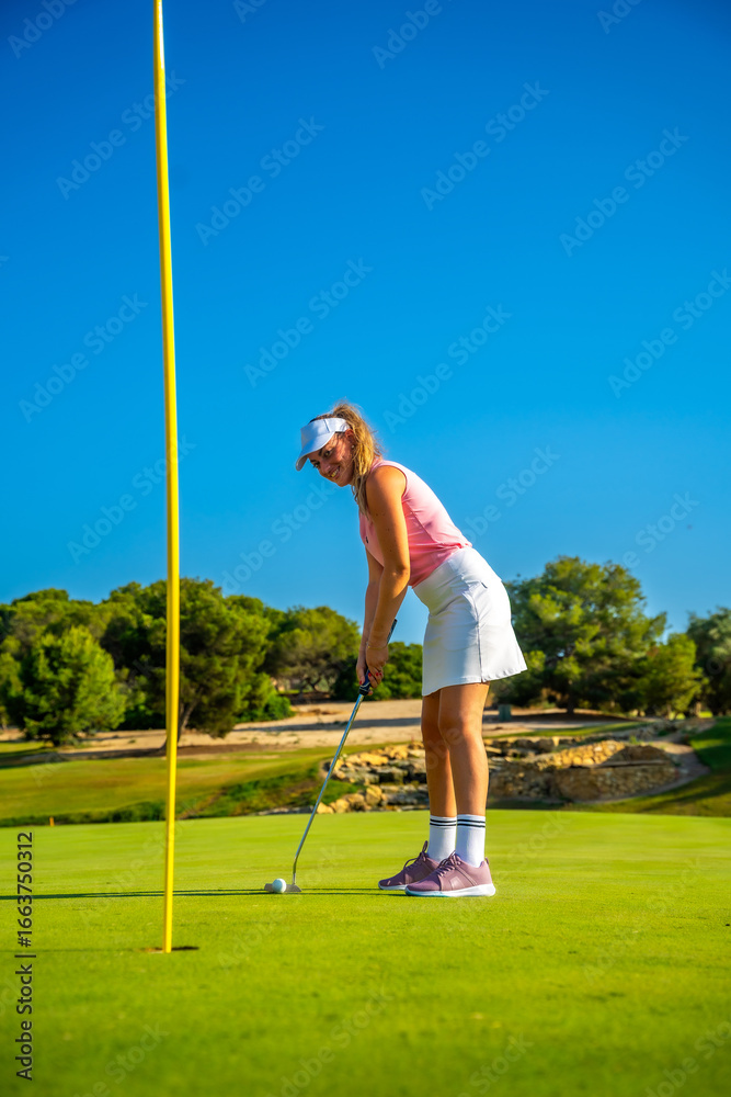 Golfer putting on the green on sunny day