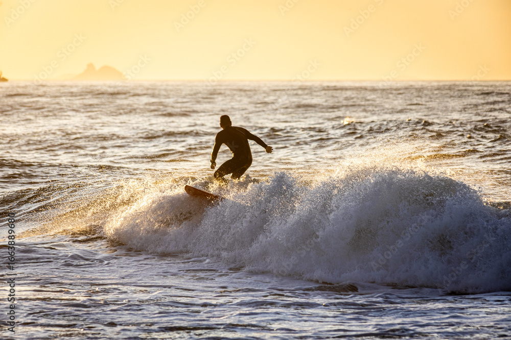 Surfer riding a wave at golden hour on a tropical beach