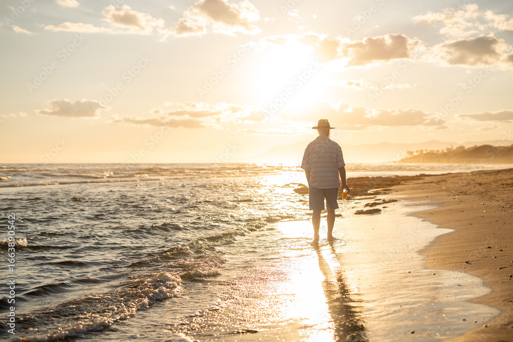 Elderly man in a straw hat walking barefoot along the beach shoreline at golden hour, holding a glass of orange juice and enjoying the peaceful sunset over the calm sea.