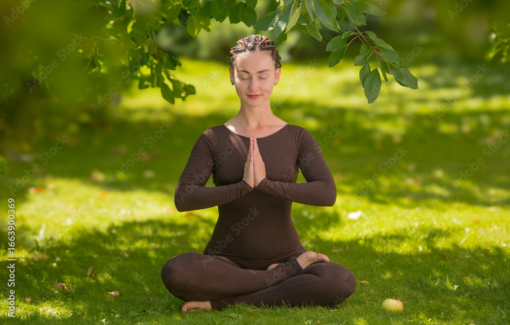 young lady doing yoga on the grass