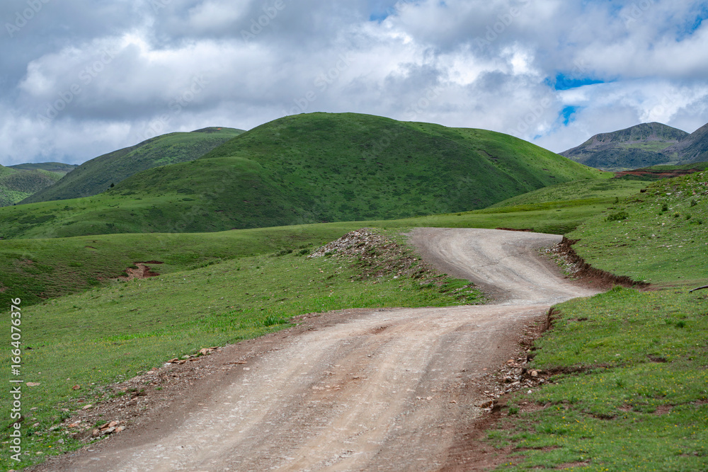 winding dirt road and green mountain