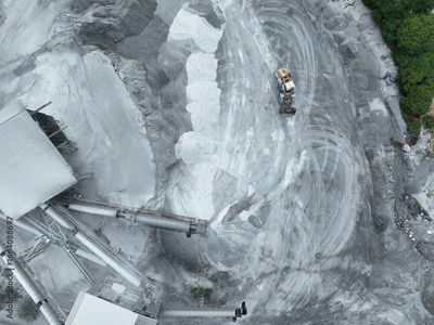 Aerial view of granite and limestone crushing plant with excavators processing raw stone into construction aggregates for concrete and infrastructure development. Stone mill factory.