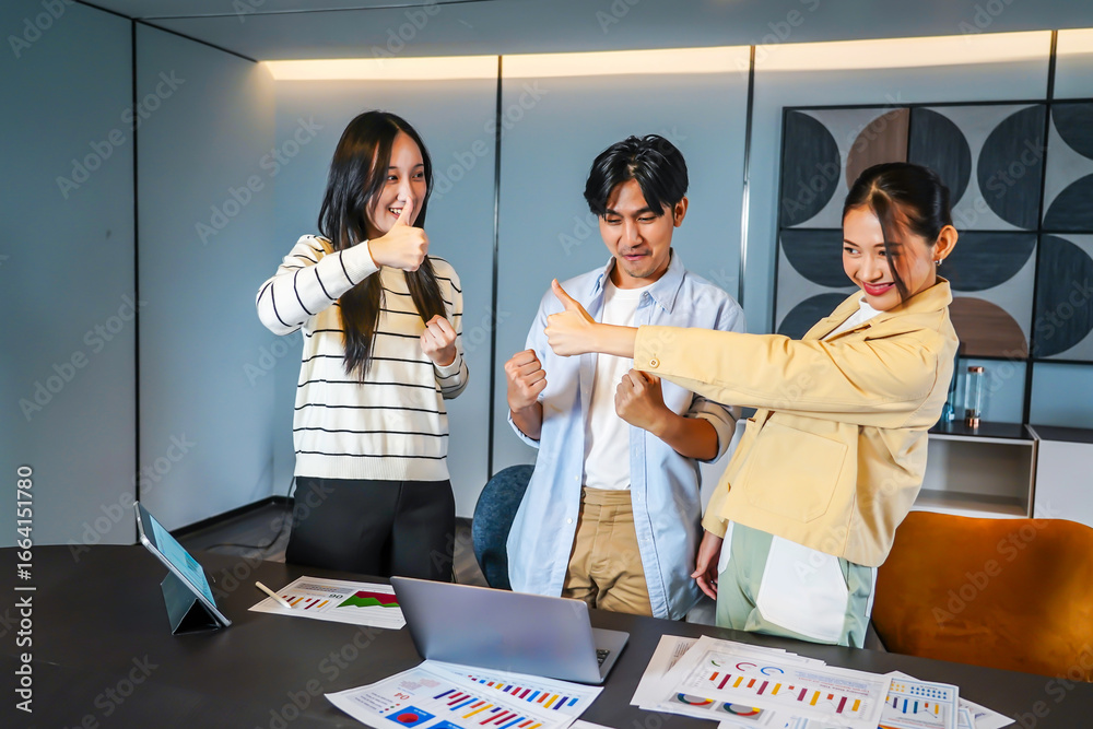 Three young professionals express their joy and enthusiasm, giving thumbs-up gestures in a stylish office. Papers and a laptop showcasing their project surround them, accentuating their teamwork.