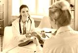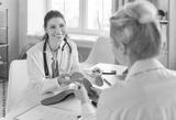Orthopedist offering orthopedic insoles to patient at medical office appointment. Doctor podiatrist holding two individual orthotic insets for flat foot correction and arch support. Recovery concept
