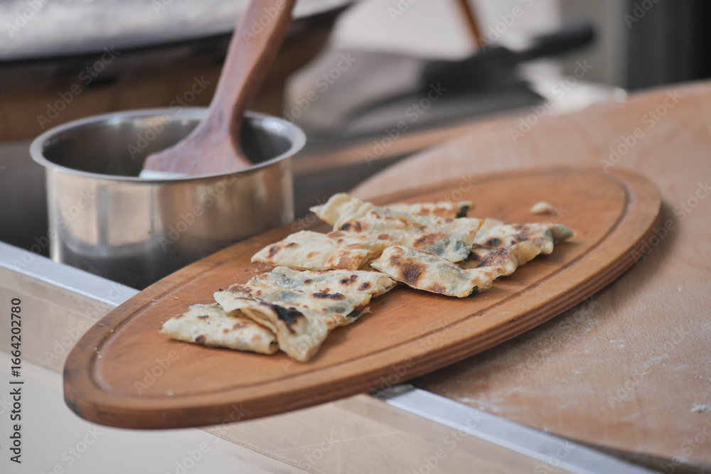 Freshly cooked flatbreads on a wooden platter in a kitchen