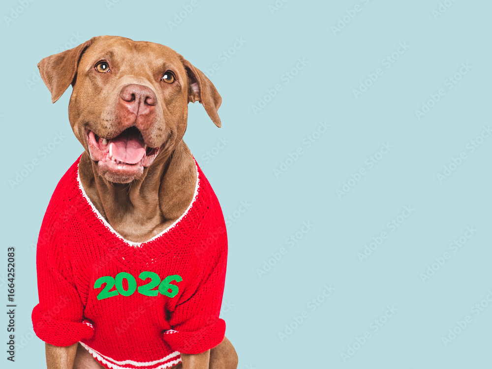 Merry Christmas and Happy New Year. Cute dog and festive costume. Dog smile. Closeup, studio shot. Congratulations for family, friends and colleagues. Pet care concept