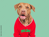 Merry Christmas and Happy New Year. Cute dog and festive costume. Dog smile. Closeup, studio shot. Congratulations for family, friends and colleagues. Pet care concept