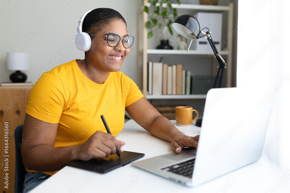 Smiling graphic designer working from home using graphics tablet and laptop