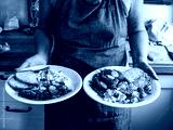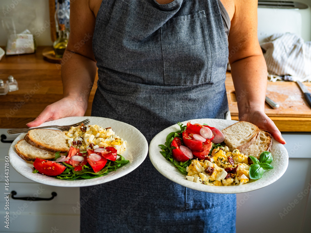Woman holding two plates with scrambled eggs with feta cheese and dried tomato, bread and tomato salad, close-up
