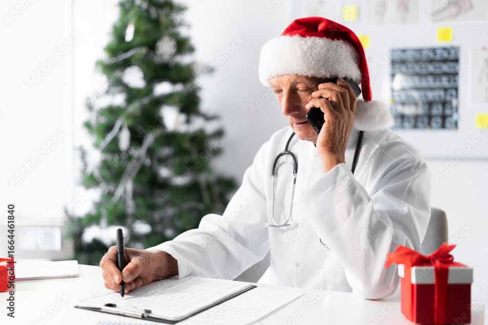 Senior Elderly Doctor in Santa hat consulting patient in phone conversation professional healthcare on the shift in the hospital on Christmas Eve. medicine, holiday, technology, and healthcare