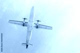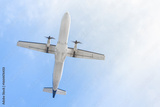A plane flying through the sky against a blue sky, view from below. The concept of air travel is an airline ticket service. Enjoying the thrill of modern flight as a commercial airplane