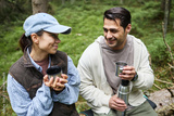 Young adult Caucasian man and young adult Caucasian woman sitting outdoors in forest, holding metal cups and thermos smiling at each other enjoying break during hike