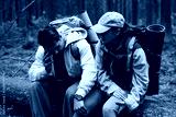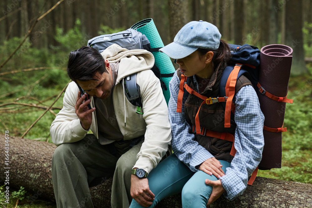 Young adult Caucasian man sitting on fallen tree in forest talking on smartphone, while young adult Asian woman with backpack sitting beside him listening attentively during hiking trip