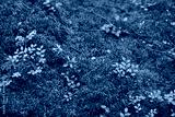 Green moss covering forest floor with small leafy plants and scattered twigs creating natural ground texture, dense vegetation spreading across woodland surface