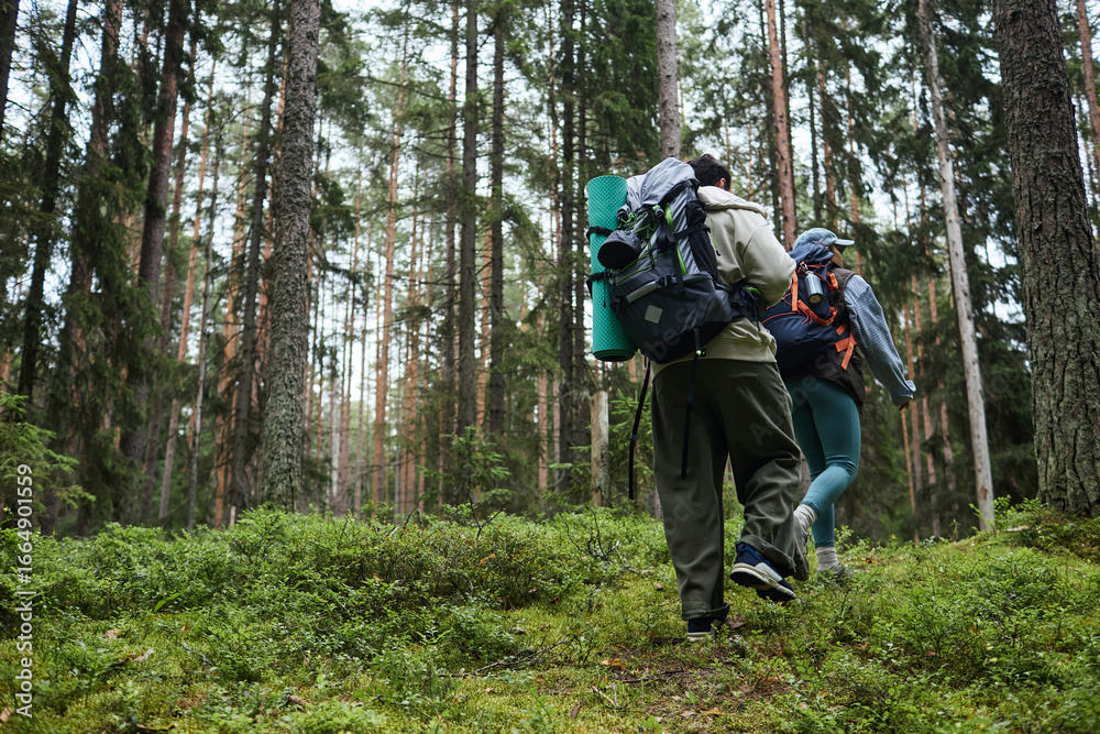 Young adult Caucasian man and young adult Caucasian woman hiking through dense forest carrying backpacks, walking side by side on grassy terrain surrounded by tall trees