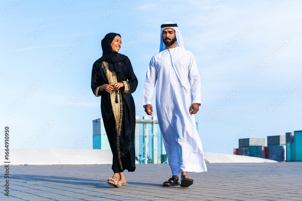 Traditional arab couple wearing emirati clothing dating outdoors
