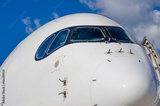 Passenger airplane nose cockpit in blue clouds sky