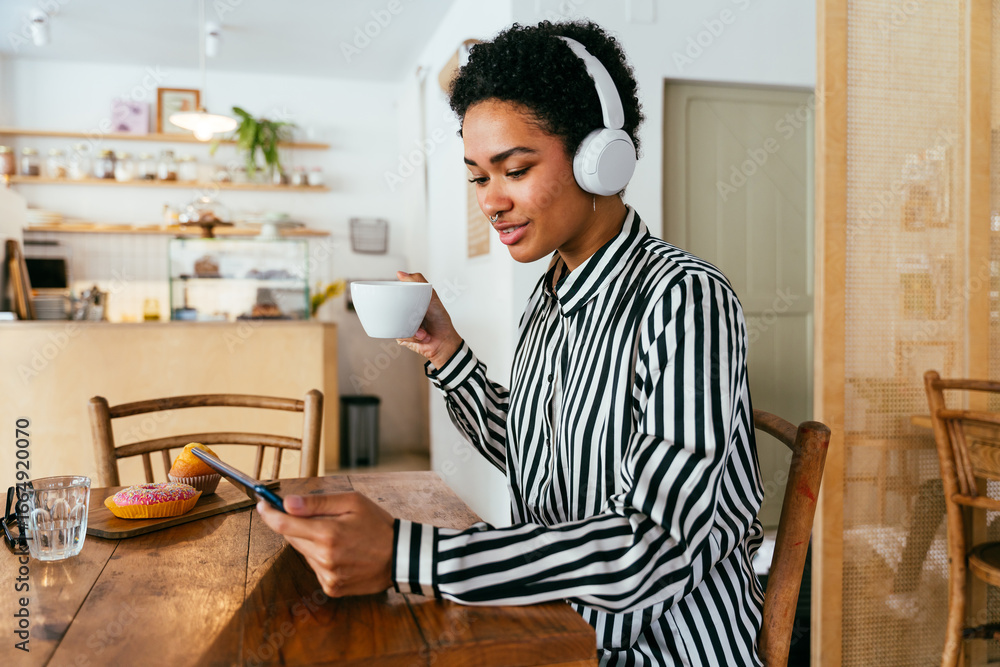Beautiful young african woman with short hair sitting in a bar cafeteria