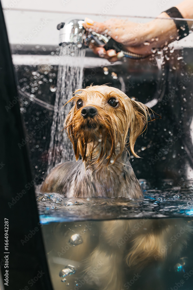 Dog grooming session featuring a wet Yorkshire Terrier in a tub, with water splashing around, showcasing the grooming process and the bond between pet and groomer in a bright, clean environment
