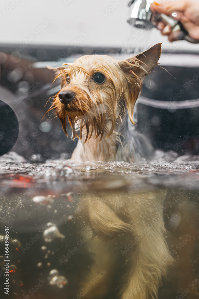Dog grooming session featuring a wet Yorkshire Terrier being bathed with water splashes, showcasing the grooming process and the care involved in pet hygiene and maintenance for furry companions