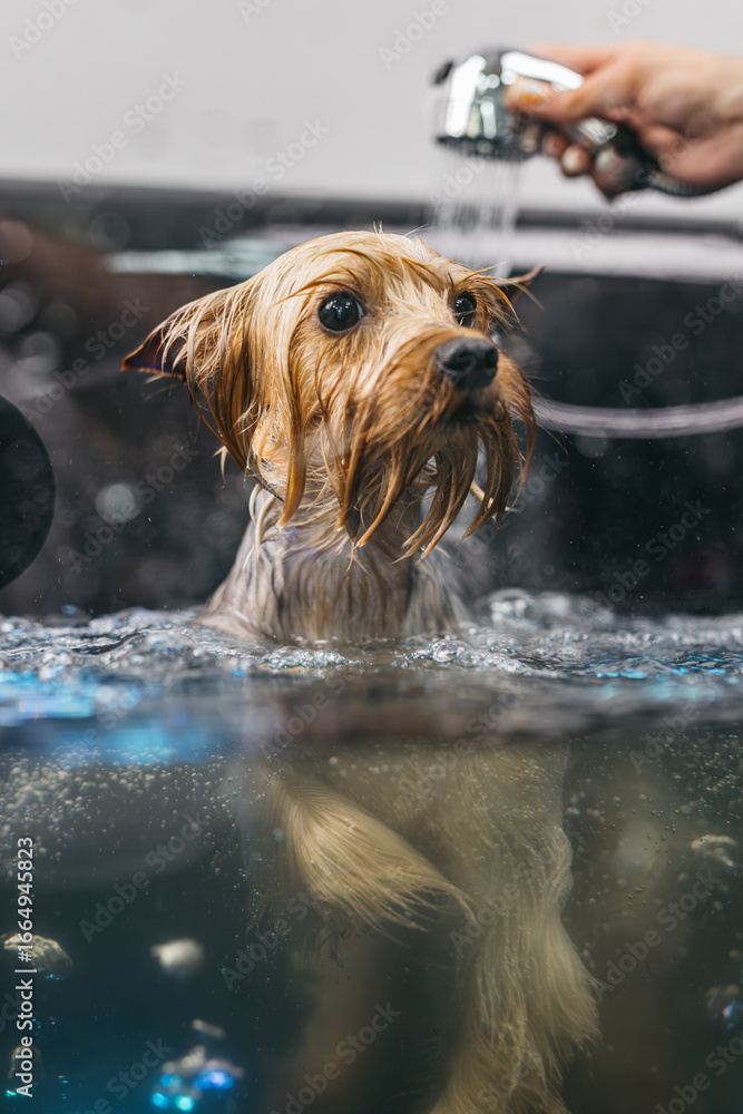 Dog being groomed in a professional pet grooming salon, with water splashing around, showcasing the grooming process and the attentive care provided by the groomer for a clean and healthy pet