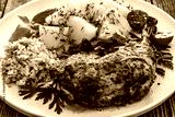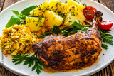 Oven roasted chicken leg with boiled potatoes and young cabbage salad on wooden table