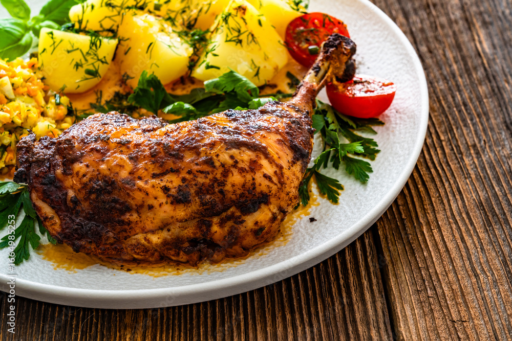 Oven roasted chicken leg with boiled potatoes and young cabbage salad on wooden table