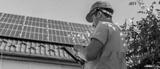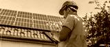 Engineer with Tablet Inspecting Solar Panels on Roof