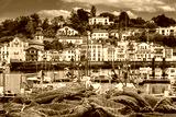 Traditional half-timbered basque houses in port of Saint Jean de Luz, Nouvelle-Aquitaine, France