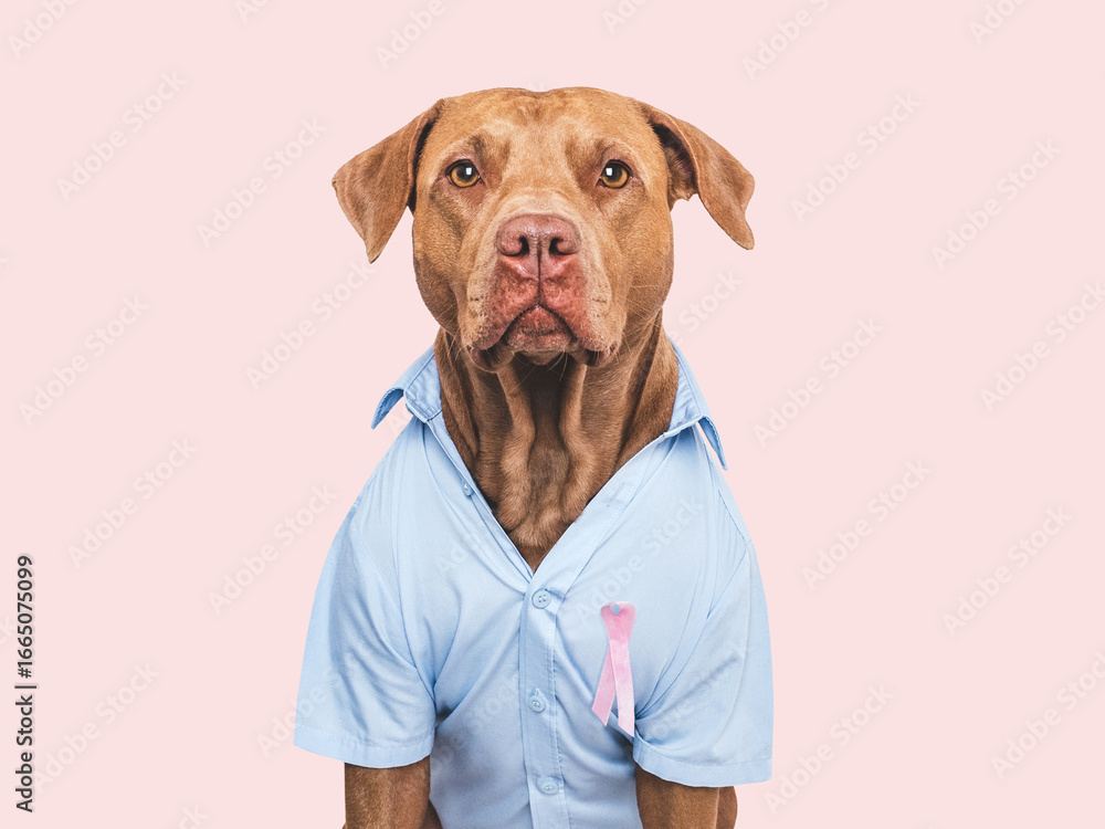 Cute puppy and pink ribbon. Express moral support. Closeup, indoors. Studio shot. Isolated background. Health care concept