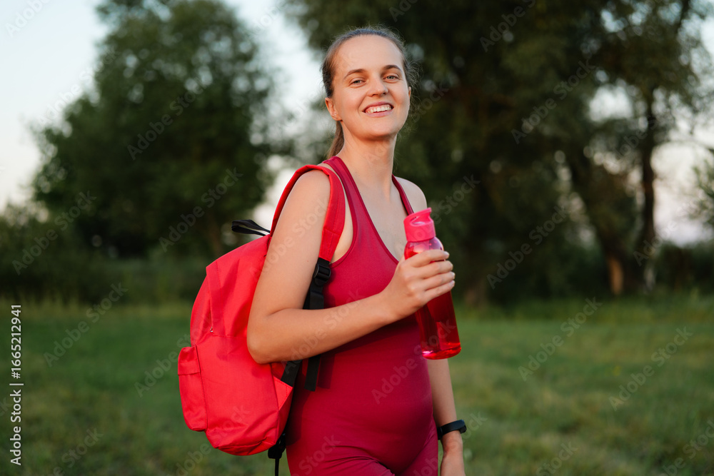 A joyful young woman in a red bodysuit with a red backpack smiles while holding a water bottle after a workout in a sunny park.