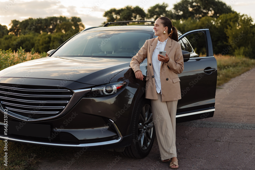 A confident young businesswoman in a blazer and trousers stands by a black car at sunset, holding her phone.